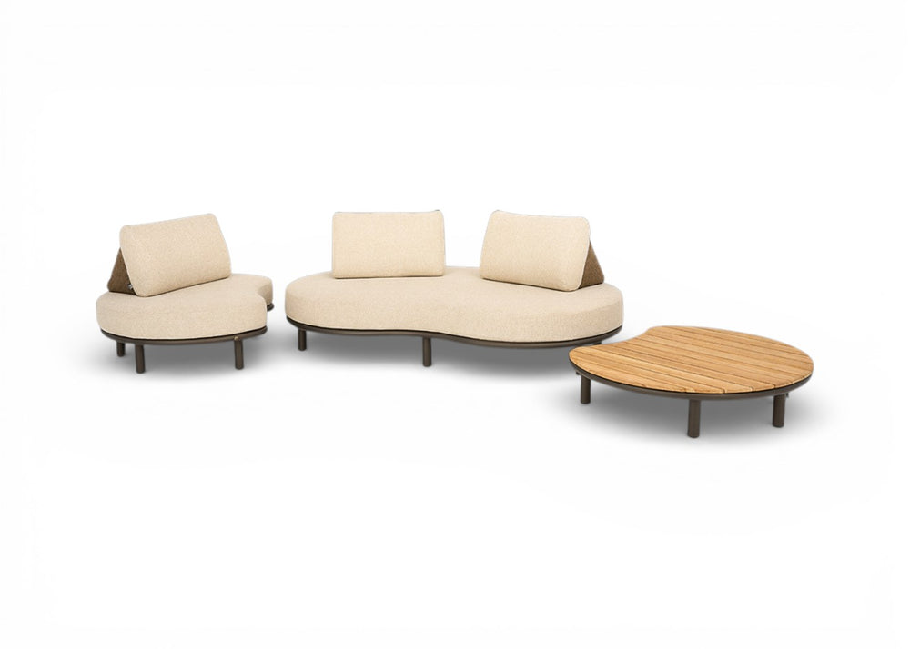 De Apple Bee Moon Island Loungeset Nr. 3 is een verfijnde en compacte opstelling die design en ultiem loungecomfort combineert. Deze 3-delige set bestaat uit de royale 2,5-zits bank, een luxe loungestoel en de kenmerkende teak-aluminium salontafel. Met zijn zachte, ronde vormen en het warme kleurenpalet is deze set een sieraad voor elk modern terras of sfeervolle veranda. Dankzij de innovatieve, losse rugsteunen geniet u van een zitervaring die u volledig naar eigen hand kunt zetten.