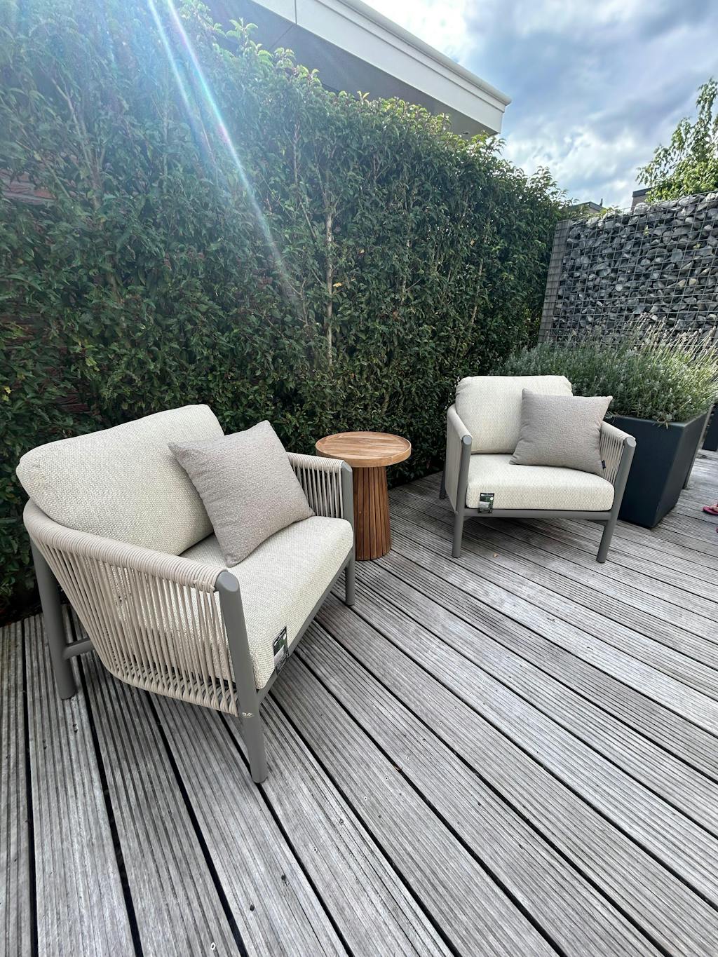 Het aluminium frame is omvlochten met outdoor textileen en is volledig weerbestendig en onderhoudsvrij. Zo geniet je jarenlang zorgeloos van comfort en een warme, natuurlijke uitstraling.