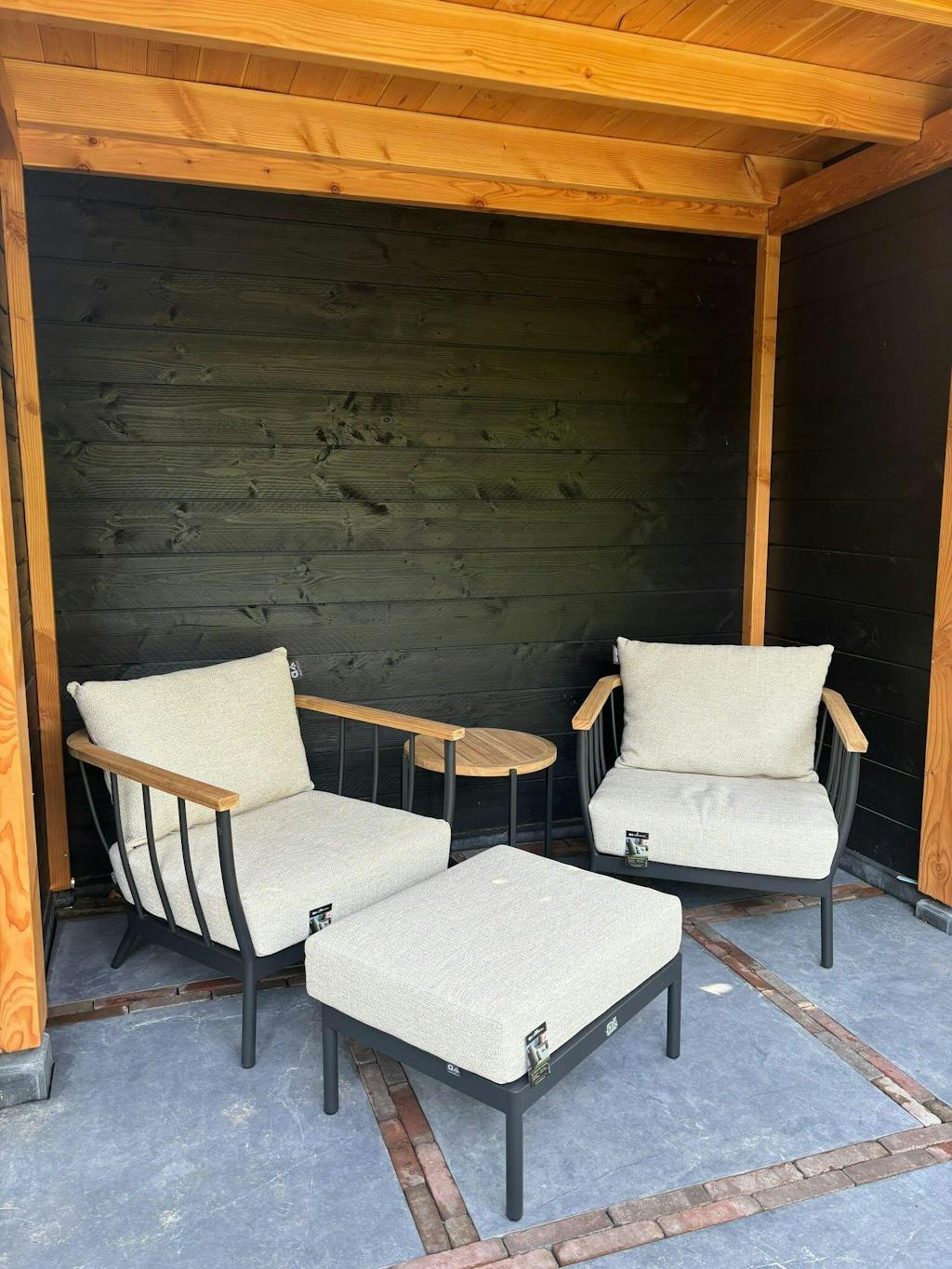 Het matzwarte aluminium frame en de teakhouten leuningen zijn weerbestendig en onderhoudsvrij, voor jarenlang zorgeloos genieten met een warme, natuurlijke uitstraling.