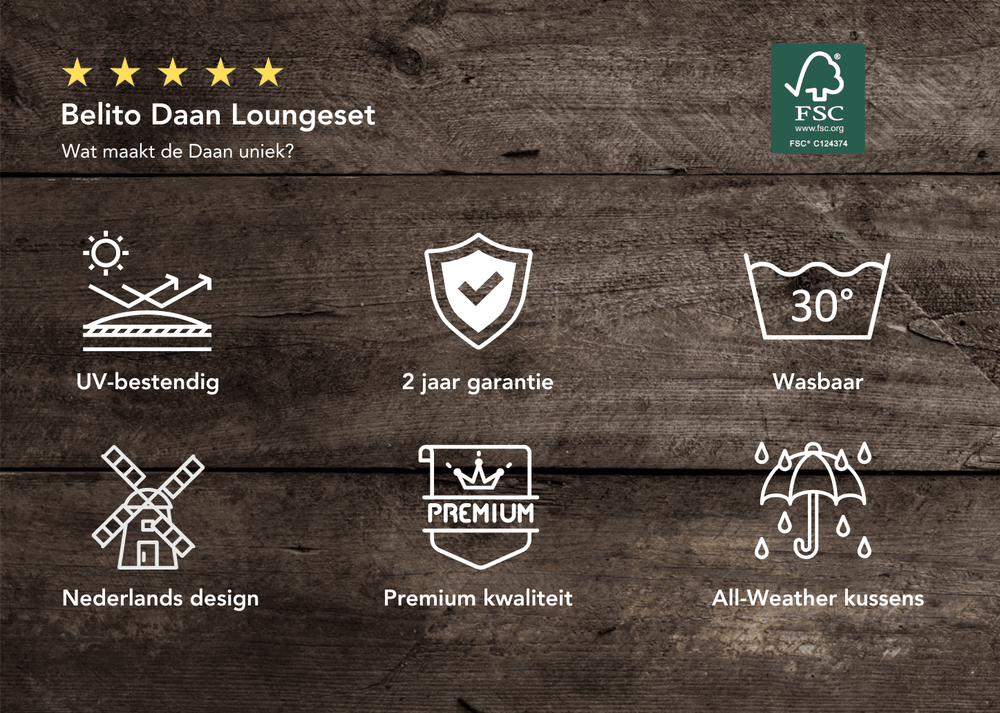 Creëer een stijlvolle buitenruimte met de Belito Daan loungebank. Bestel vandaag nog en wij leveren de bank volledig gemonteerd bij u thuis. Onze bezorgers nemen al het verpakkingsmateriaal mee, zodat u direct kunt genieten van uw nieuwe tuinmeubel.
