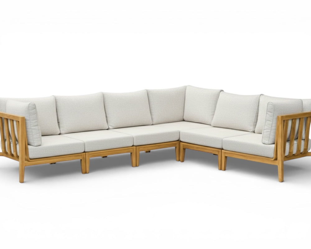 Ja, het duurzame teakhouten frame en de all-weather kussens maken de loungeset bestand tegen regen en zon. De kussens drogen binnen 1-2 uur na een regenbui.