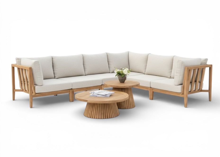 Met de Belito Daan Loungeset XL haalt u een exclusieve, volledig teakhouten set in huis die natuurlijke charme combineert met een robuuste constructie. Deze royale 8-delige modulaire set is vervaardigd uit hoogwaardig, SVLK-gecertificeerd kern-teakhout, wat bekend staat om zijn extreme stevigheid en weerbestendigheid. Met een indrukwekkende afmeting van 245 x 318 cm biedt deze XL-opstelling ruim plaats aan 6 tot 7 personen, waardoor het de ideale keuze is voor wie op zoek is naar luxe en comfort in de buitenruimte.