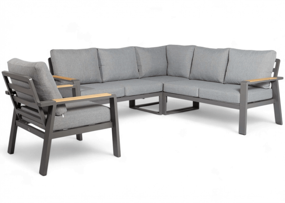 De Belito Lotte Loungeset (220 x 220 cm) is de perfecte keuze voor wie op zoek is naar symmetrie en comfort op het terras. Deze set heeft een gelijke hoekopstelling, waardoor hij in elke tuin prachtig tot zijn recht komt. Om de set compleet te maken, wordt deze geleverd inclusief een extra luxe loungestoel. De combinatie van het strakke antraciet aluminium frame, de warme teakhouten accenten en de rijk gevulde kussens zorgt voor een moderne en uitnodigende sfeer.