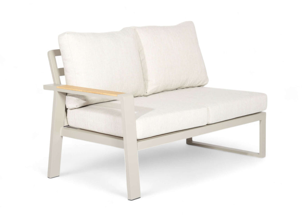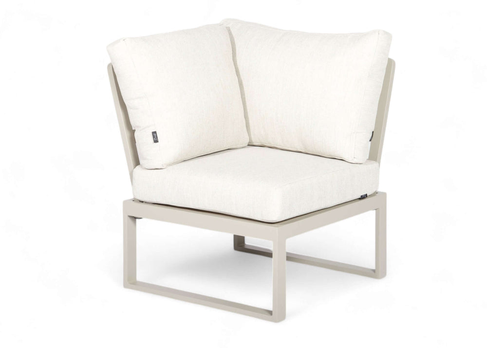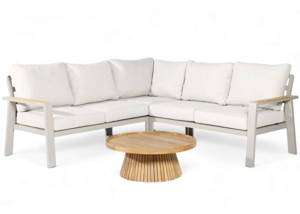 De Belito Lotte Loungeset in de warme kleur Taupe is de perfecte combinatie van modern design en natuurlijke materialen. Deze symmetrische hoekopstelling van 220 x 220 cm wordt gecombineerd met de prachtige Belito Daan koffietafel (Ø 80 cm). De tafel is volledig vervaardigd uit hoogwaardig teakhout, wat een schitterend contrast vormt met het strakke taupe aluminium frame. Samen met de luxe, rijk gevulde Olefin kussens creëert u een sfeervolle loungeplek waar u het hele jaar door van kunt genieten.