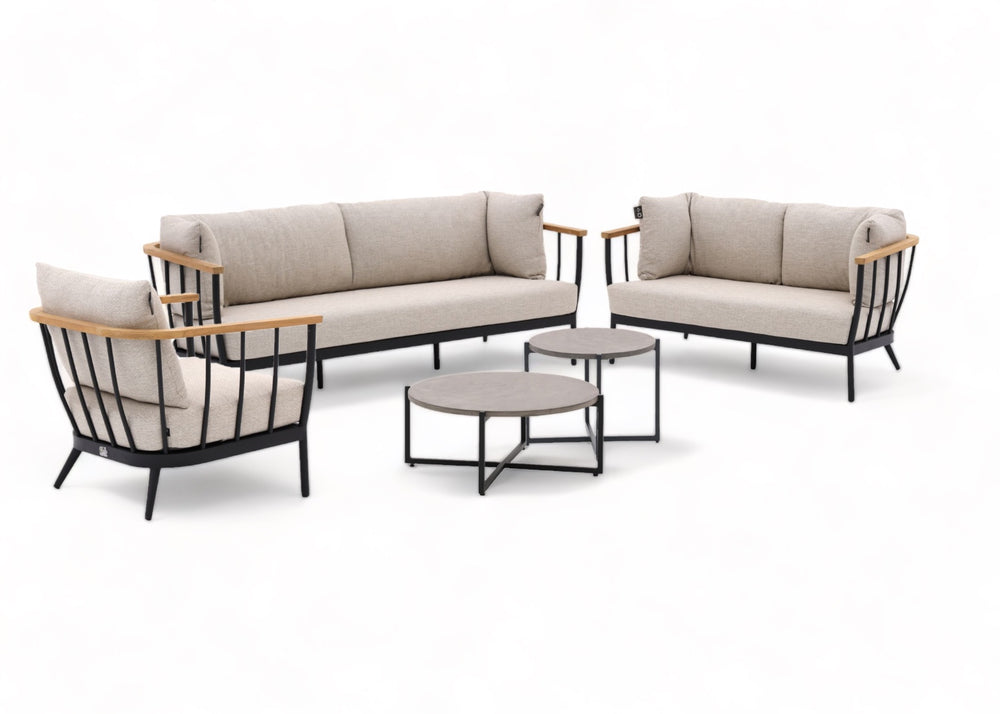 Het matzwarte aluminium frame en de teakhouten leuningen zijn weerbestendig en onderhoudsvrij, voor jarenlang zorgeloos genieten met een warme, natuurlijke uitstraling.