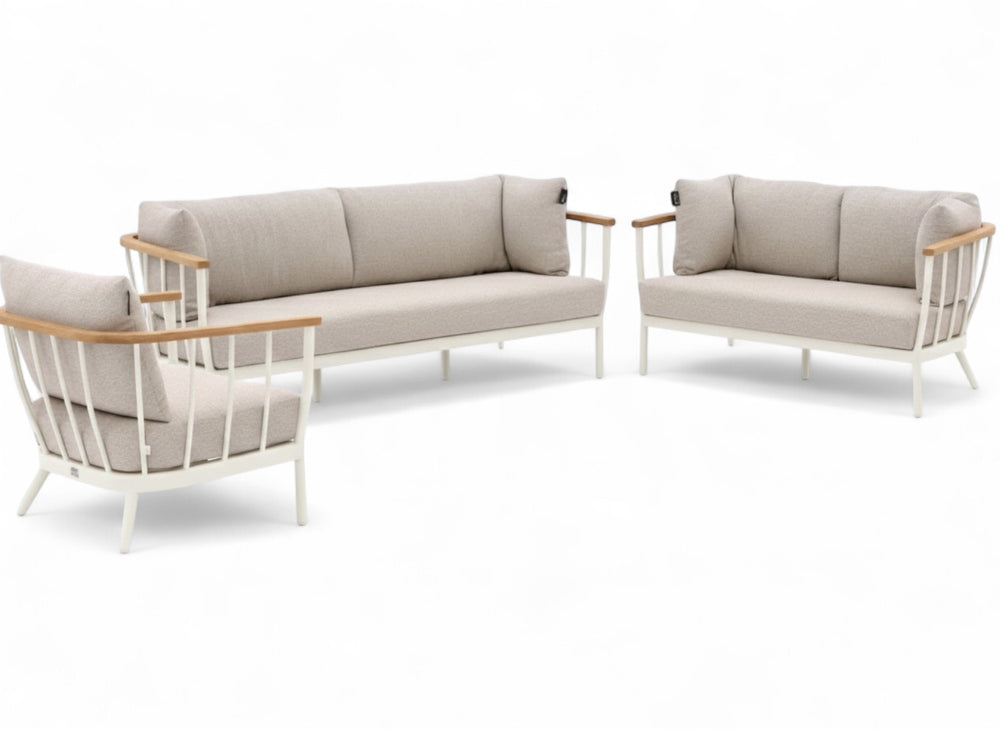 De Apple Bee Condor Oyster Loungeset biedt een perfecte combinatie van robuust design en natuurlijke elementen. Het Oyster gepoedercoate aluminium frame geeft de set een strakke vriendelijke uitstraling, terwijl de teakhouten leuningen voor een warme touch zorgen.