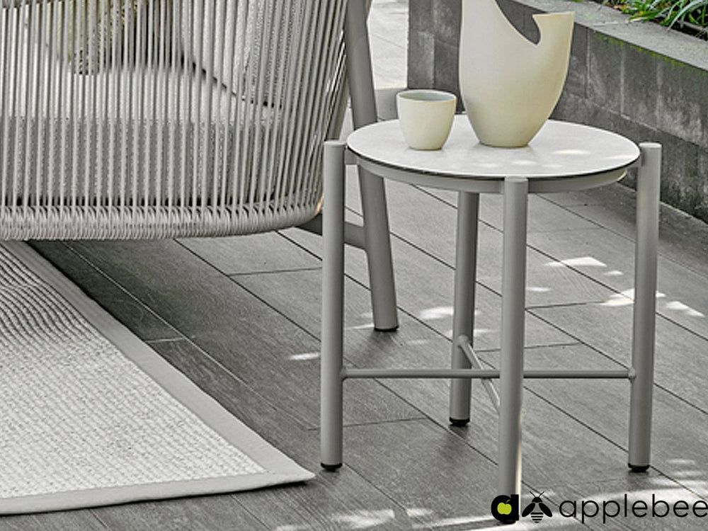 De tafels hebben een elegant keramisch glasblad dat perfect past bij het taupe aluminium frame.
