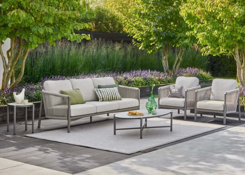 Het aluminium frame is omvlochten met outdoor textileen en is volledig weerbestendig en onderhoudsvrij. Zo geniet je jarenlang zorgeloos van comfort en een warme, natuurlijke uitstraling.