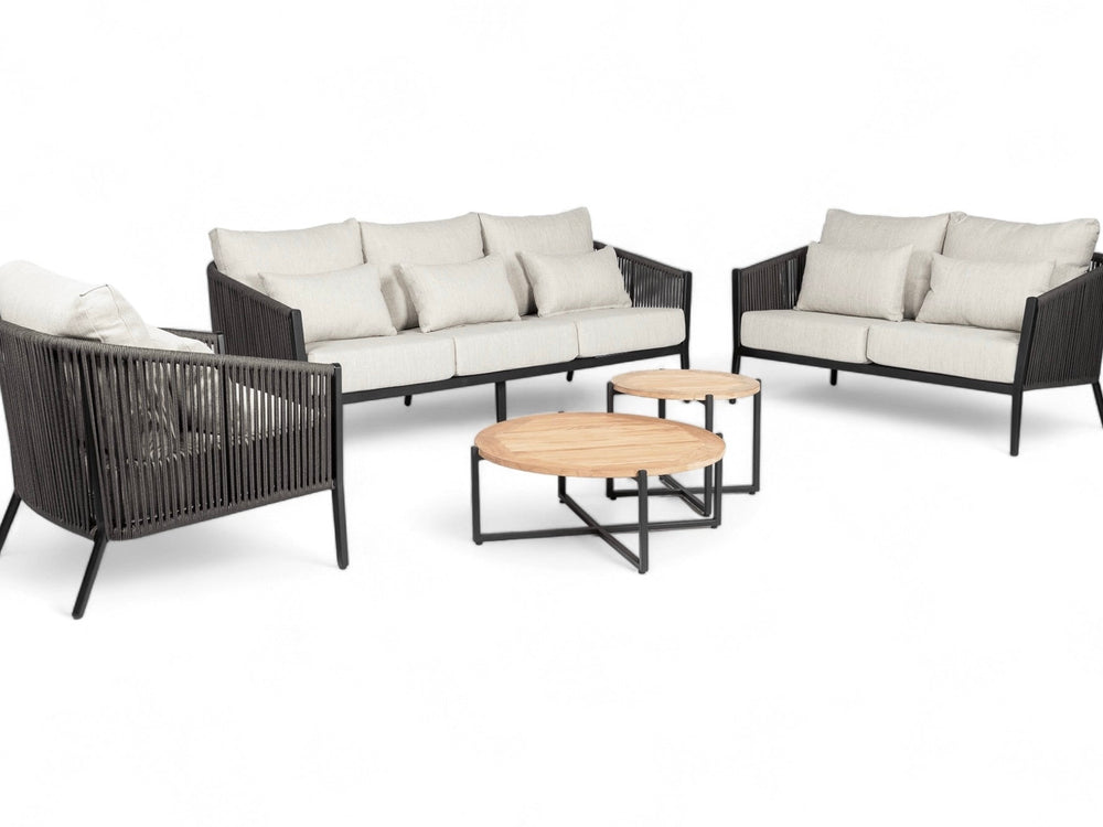 De set bestaat uit een ruime 3-zits bank, een 2-zits bank, een loungestoel, twee koffietafels met teakhouten blad én een hocker voor extra comfort. De combinatie van duurzame materialen en een eigentijds design maakt deze set een blikvanger in iedere tuin.