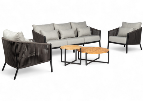 De Ouddorp Loungeset van Belito biedt een moderne uitstraling met ultiem comfort. Het matzwarte aluminium frame in combinatie met rope (textileen) accenten zorgt voor een stijlvolle toevoeging aan elke buitenruimte. Deze set biedt plaats aan 5 tot 6 personen en is perfect voor ontspannen middagen of gezellige avonden in de tuin.