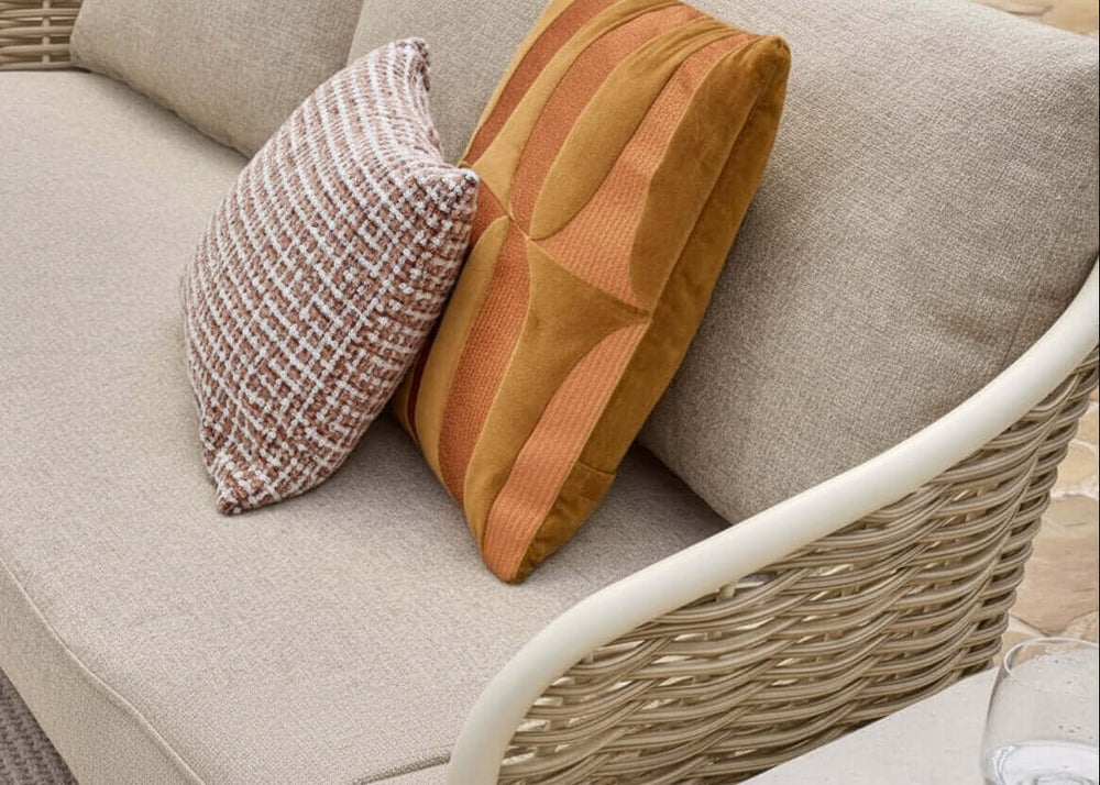 Het aluminium frame en de wicker afwerkingen zijn weerbestendig en onderhoudsvrij, wat zorgt voor jarenlang zorgeloos genieten met een warme, natuurlijke uitstraling.