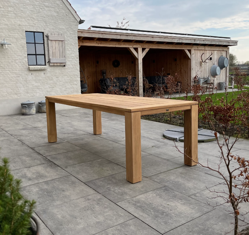 Deze teak tuintafel is ontworpen om de seizoenen te doorstaan en zal door de tijd heen op natuurlijke wijze verkleuren, wat bijdraagt aan de charme en authenticiteit van het product. Als u de oorspronkelijke kleur wilt behouden, is het mogelijk om een teakbehandelaar bij te bestellen en de tafel op deze manier te onderhouden. Wanneer u aan het begin van ieder seizoen uw tuintafel onderhoud kan deze jaren mee.