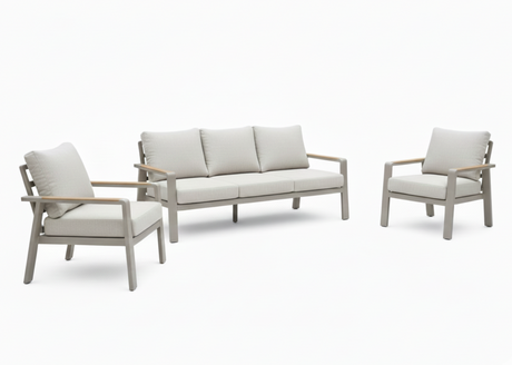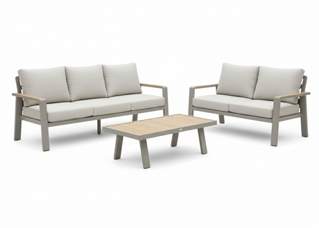 Het strakke aluminium frame met teakhouten accenten geeft deze set een moderne, luxe uitstraling die perfect in elke tuin past.