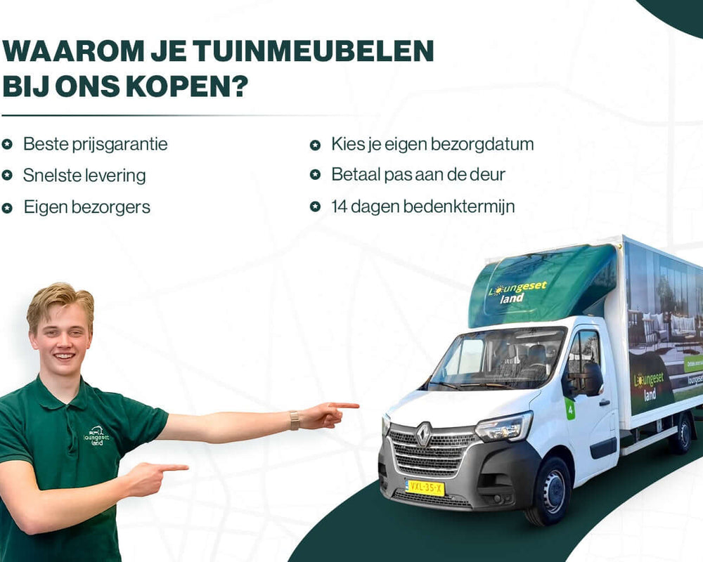 Onze bezorgers leveren de Belito Daan Loungeset volledig gemonteerd en nemen al het verpakkingsmateriaal mee. Zo kun je direct genieten!