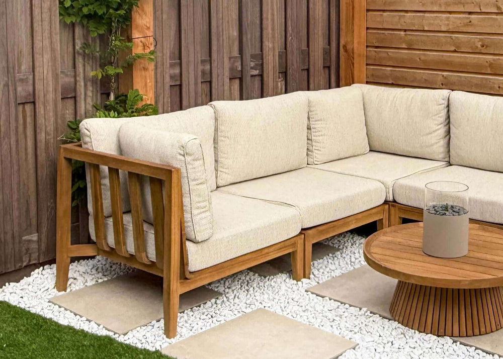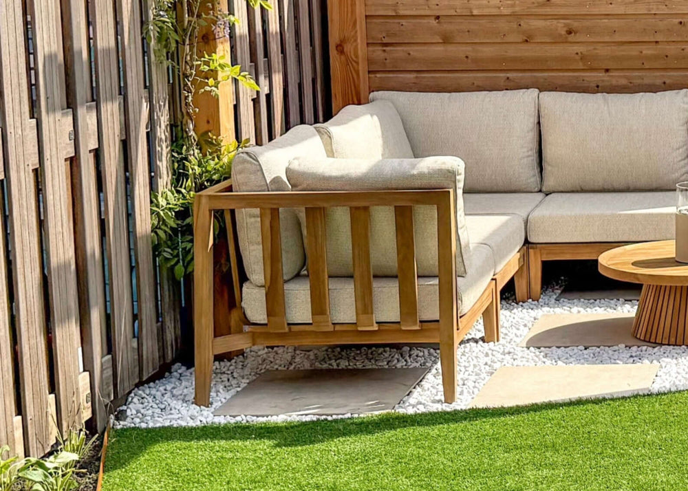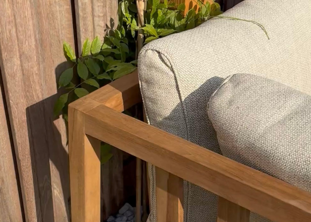 Het frame van de loungeset is vervaardigd uit teakhout, een materiaal dat gewaardeerd wordt om zijn stevigheid en weerbestendigheid. Het hout zorgt voor een warme en uitnodigende sfeer in je buitenruimte en biedt tegelijkertijd stevige ondersteuning.