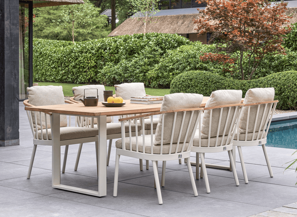 De Apple Bee Condor Tuinset combineert een strak, modern design met ultiem comfort. Dankzij het slanke ontwerp en de Oyste accenten is deze tuinset perfect voor een moderne tuin of terras. De Condor tuinstoelen hebben een Oyster aluminium frame, afgewerkt met teakhouten details op de arm- en rugleuningen. Dit geeft de set een verfijnde, luchtige uitstraling.