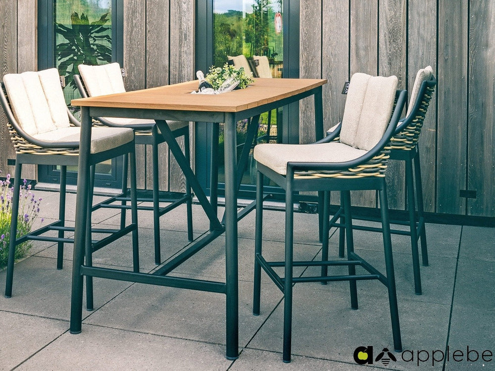 De Milou barset is van het merk Apple Bee. De tuinstoel heeft een moderne uitstraling doordat er gebruik is gemaakt is van Willow vlechtwerk. De Apple Bee Milou barstoel heeft een sterk frame dat gepoedercoat is in de kleur zwart