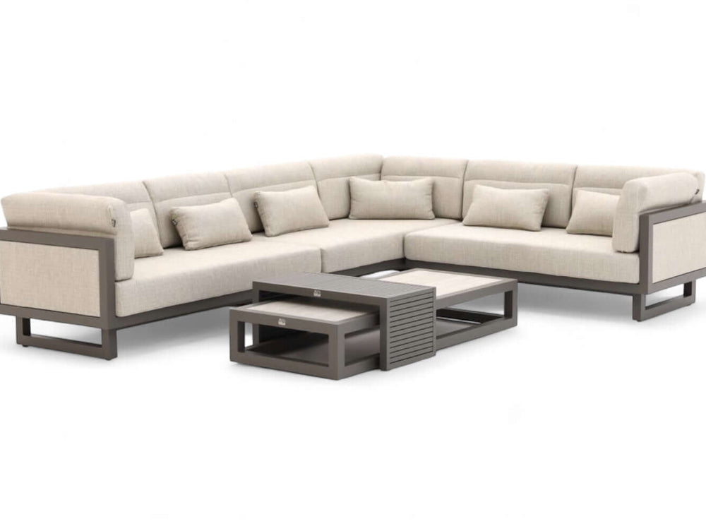 De Apple Bee Santorini is een architectonisch hoogstandje voor uw terras. Met zijn verfijnde Quartz-frame en unieke gestoffeerde panelen breekt deze set met alle standaard regels van tuinmeubilair. Het resultaat is een moderne 'indoor-look' met het ultieme comfort van een luxe loungeset, compleet met een indrukwekkende tafelset van echt keramiek.
