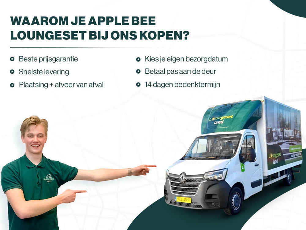 Bij Loungesetland gaan we verder dan alleen bezorgen. Wij leveren de Apple Bee Santorini direct uit eigen voorraad met onze eigen professionals. Onze bezorgers pakken de set volledig voor u uit en monteren de elementen op de gewenste plek op uw terras. U heeft geen omkijken naar de verpakkingen: al het afval en verpakkingsmateriaal nemen wij direct weer mee retour. Zo kunt u direct na levering onbezorgd genieten van uw nieuwe aanwinst. Bezoek onze showroom in Barendrecht voor een uitgebreide proefzit!