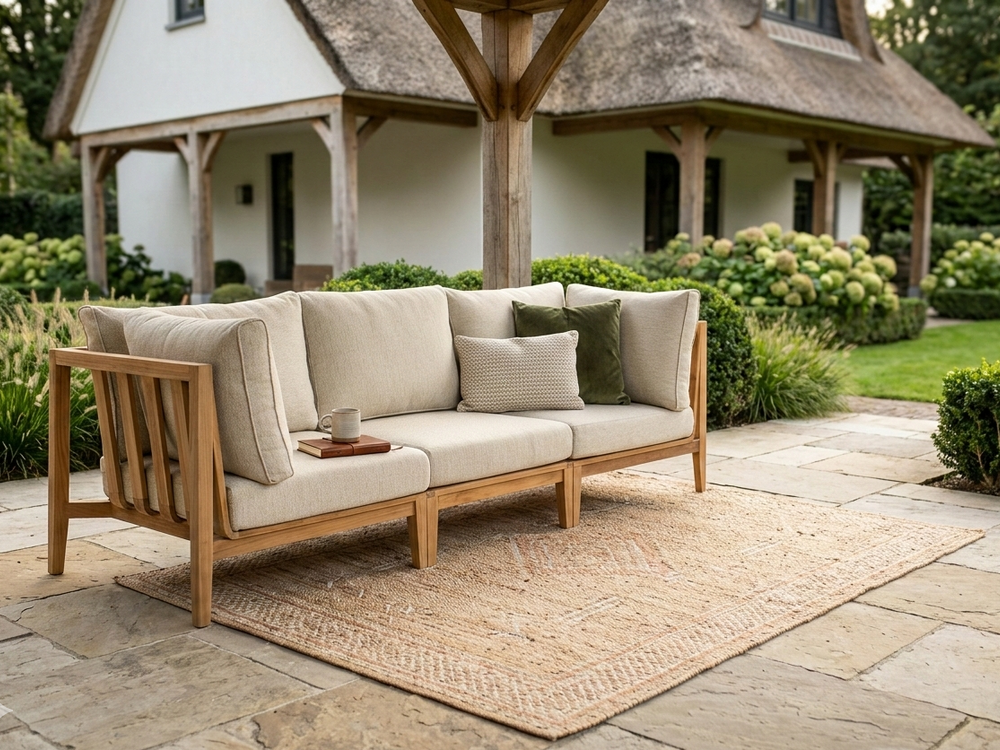 Ja, het duurzame teakhouten frame en de all-weather kussens maken de loungeset bestand tegen regen en zon. De kussens drogen binnen 1-2 uur na een regenbui.